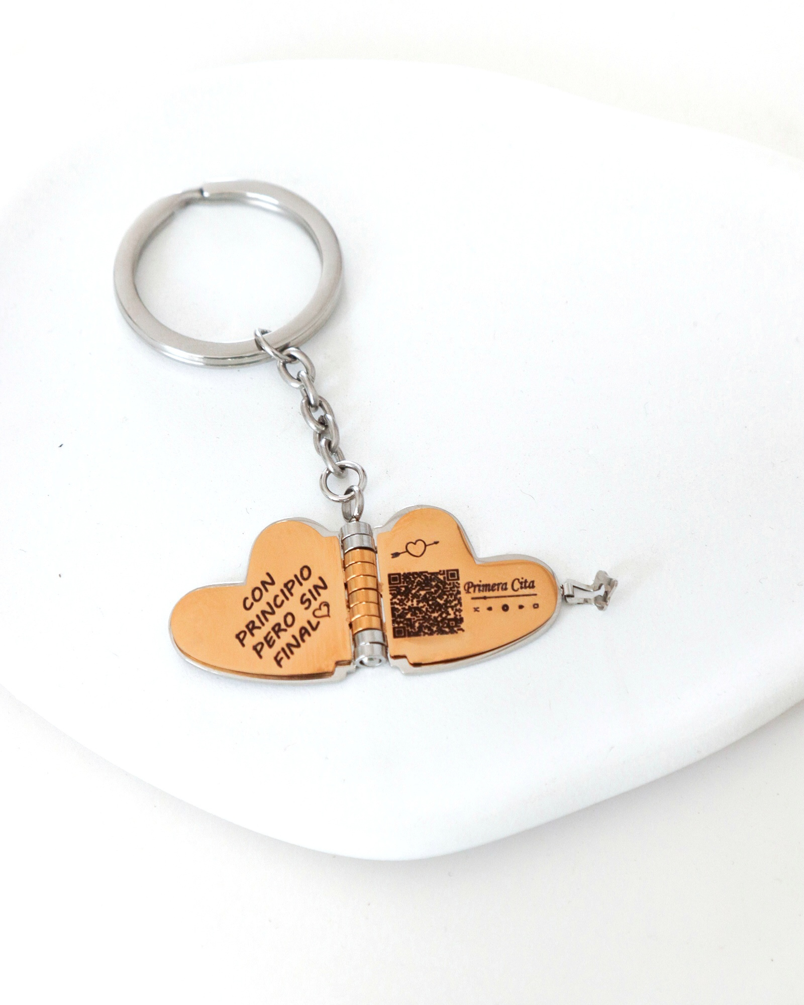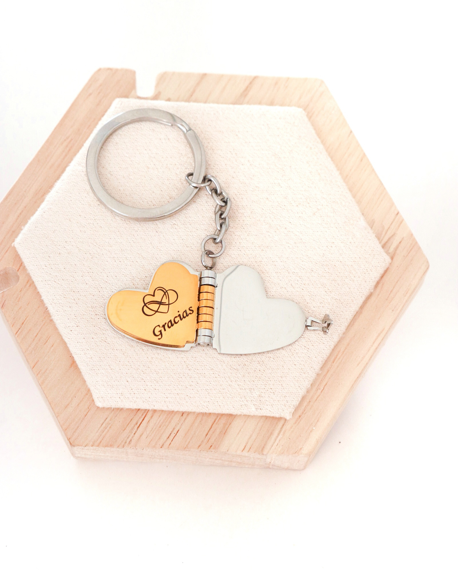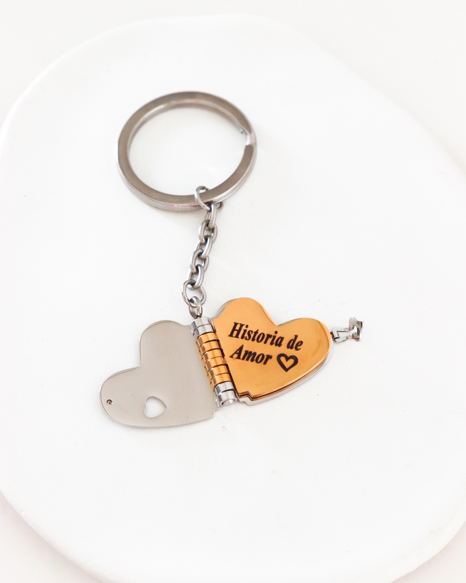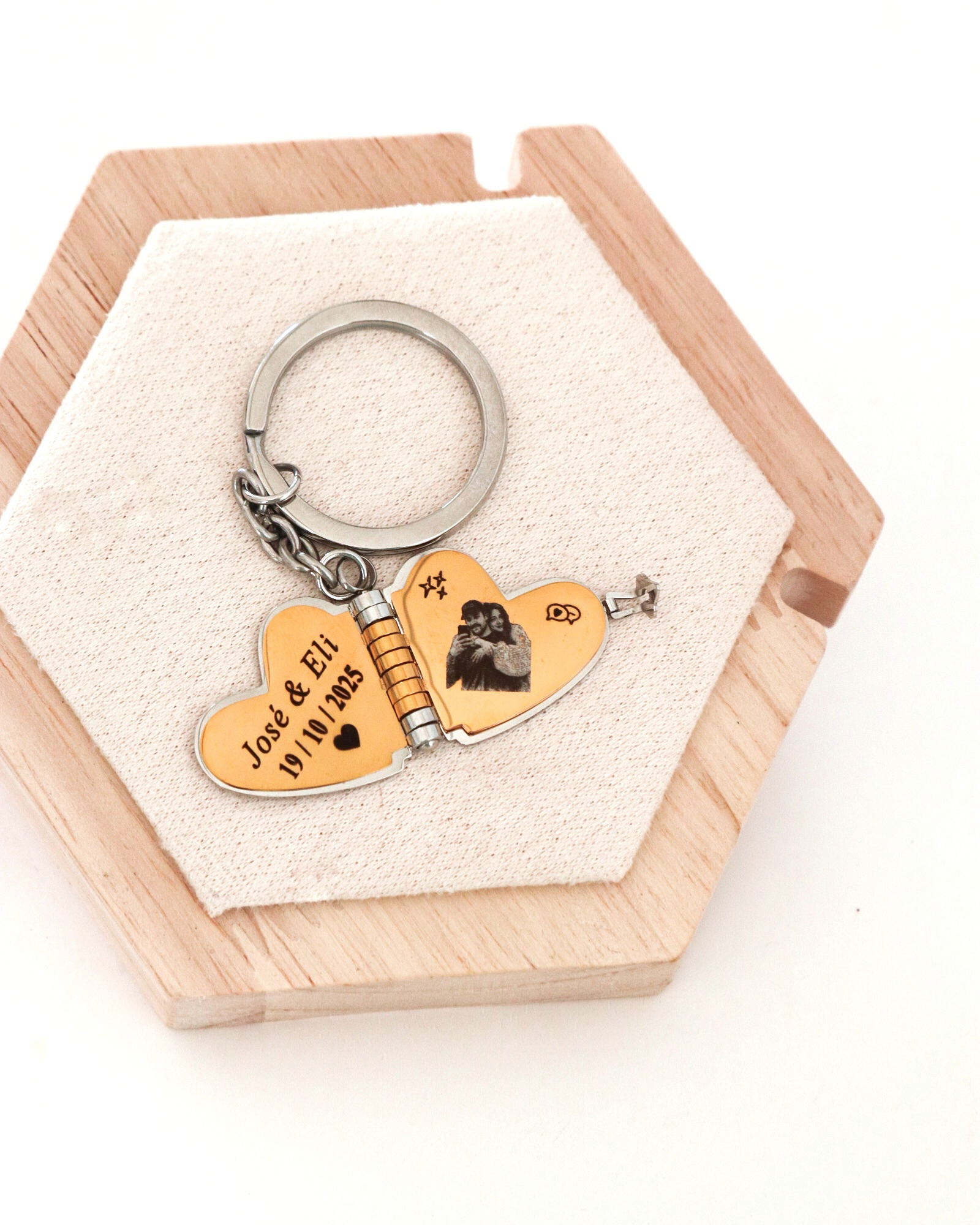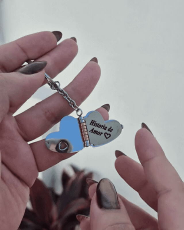 Es un llavero único que guarda en su interior momentos que no quieres olvidar. Su diseño en forma de corazón se abre para revelar una fotografía personalizada 📸 y un espacio ideal para grabar nombres, fechas o mensajes especiales ✨.